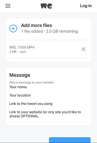 From the device you recorded on (or any device your video is saved on), visit the wetransfer.com.